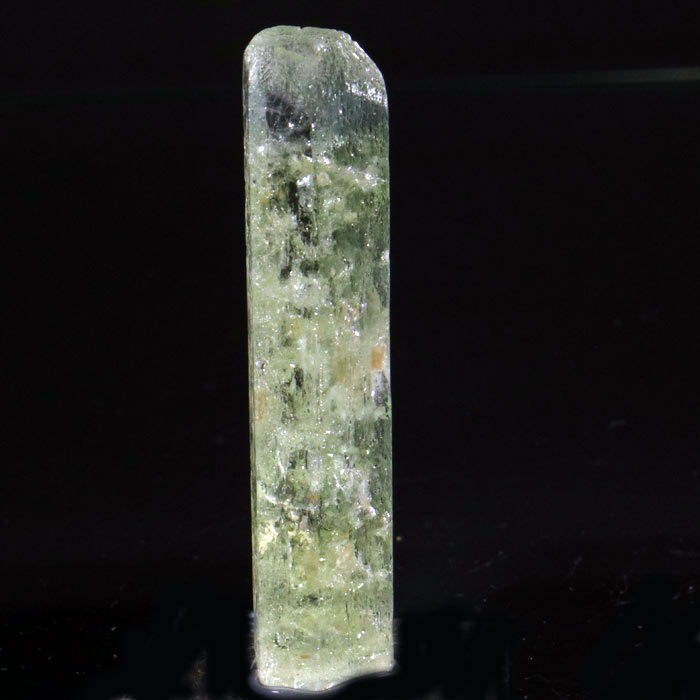 Der Kristall zeigt einige Einschlüsse über die ganze Länge verteilt, am Kopfteil ist er klar.