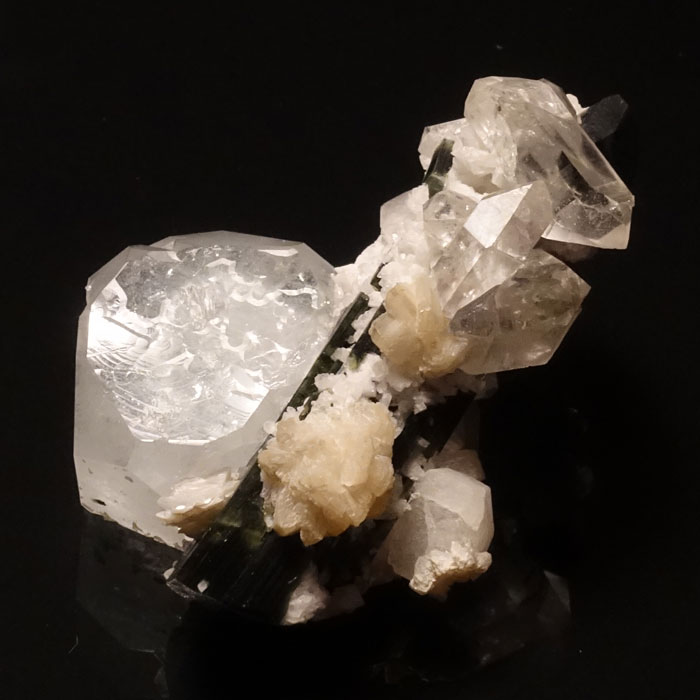 Aquamarin, Apatit und Bergkristall auf Turmalin