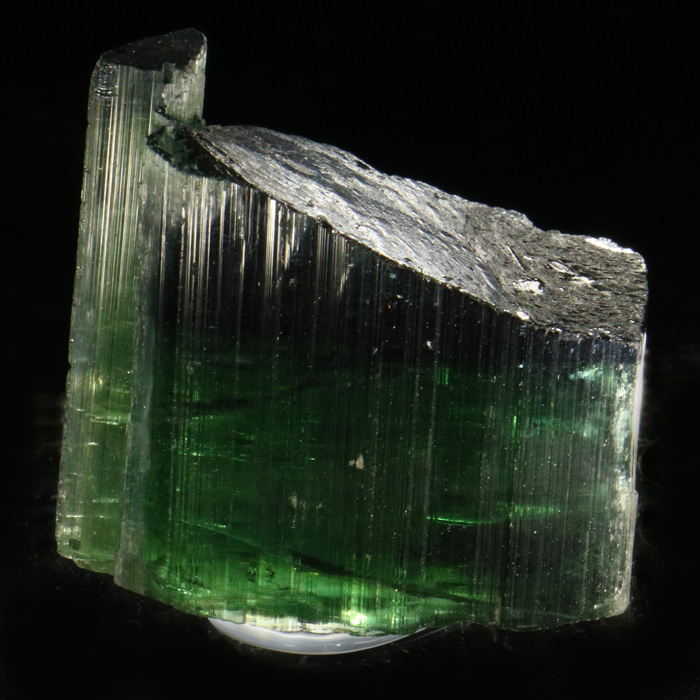 Kompletter Turmalin-Kristall von schöner Grösse. Die grüne Farbe variiert etwas von reinem Dunkelgrün (unten) zu leicht bläulichem Grün (oben). Angewachsen (links) ein schmaler vollständiger Turmalin Kristall. Die Qualität des Farbe ist einmalig schön.