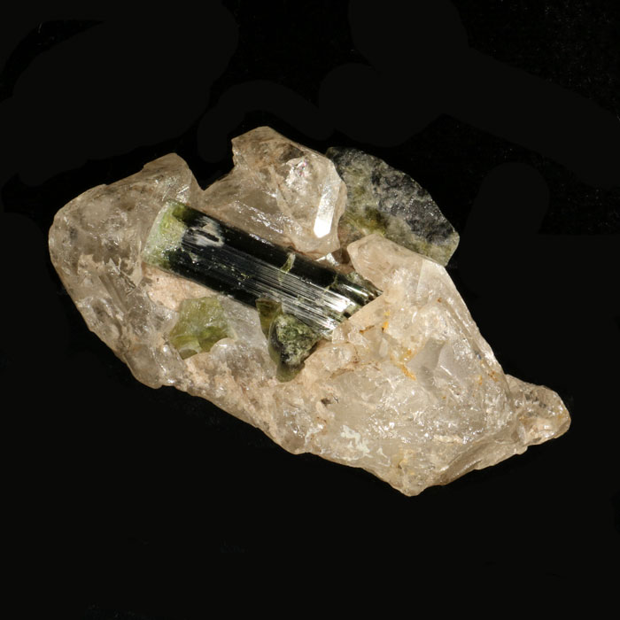 Sehr attraktive Stufe aus glänzendem Fensterquarz mit mehreren Turmalin-Kristallen in leicht variierenden Grüntönen.