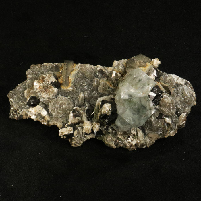 Hochinteressante Kombination: heller Fluorit, Kassiterit in glänzenden schwarzen Kristallen & Arsenopyrit auf Muskovit. Der Fluorit ist nicht ganz unversehrt.