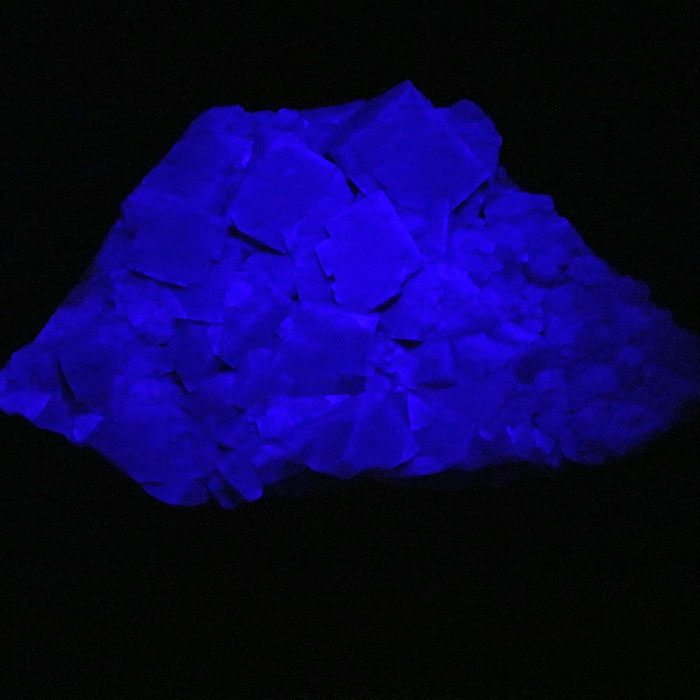 Prachtvolle, blaue bis blauviolette Fluoreszenz unter UV-Licht. Sogar im Tageslicht ist ein leichtes blaues Schimmern zu sehen.