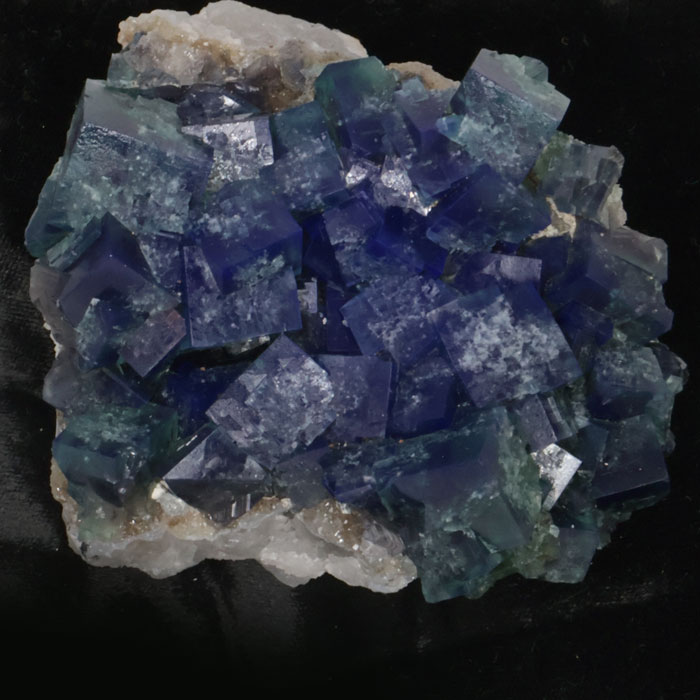 Fluorit in glänzenden, würfeligen Kristallen von tiefgrüner Farbe, aufgewachsen auf Quarz.