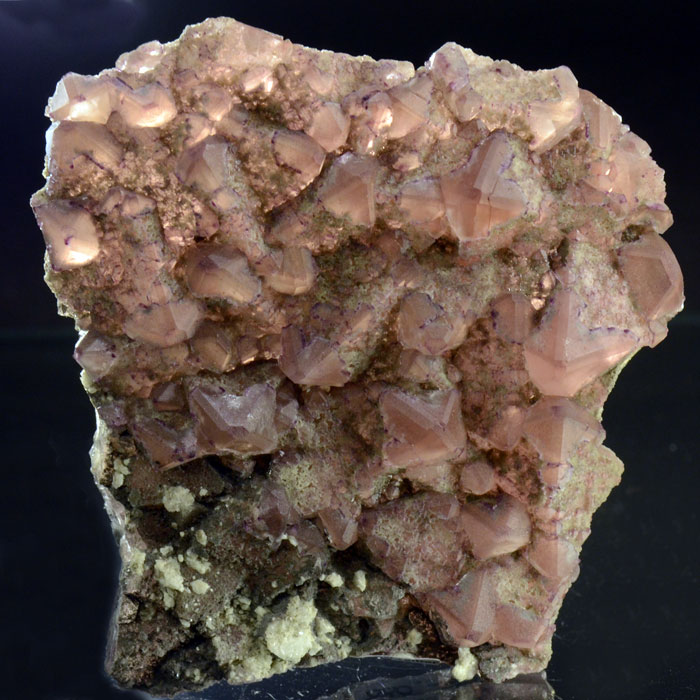 Hochinteressanter rosa Fluorit aus der berühmten Rufibach-Kluft am Vordre Zinggenstock. Ein flaches Handstück, nur aus Fluorit bestehend. Von guter Farbe und die Oktaederpyramiden sind scharf und komplett. Die Rückseite ist (ganz natürlich) eben - hier war die Fluoritplatte auf Calcit aufgewachsen, welcher sich gelöst hat.