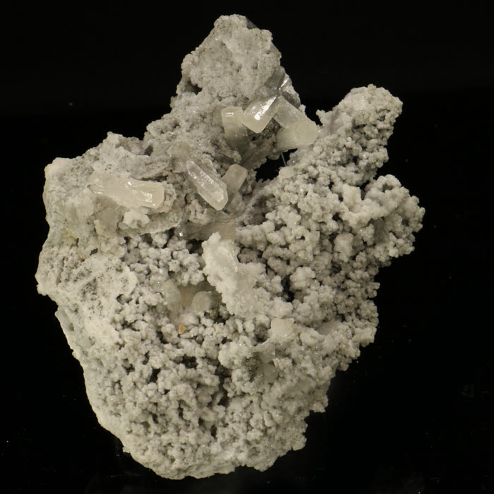 Ein hochstehendes Stück mit prismatischen Einzelkristallen von Strontianit aus der klassischen Fundstelle Oberdorf-Niederdorf in der Steiermark.