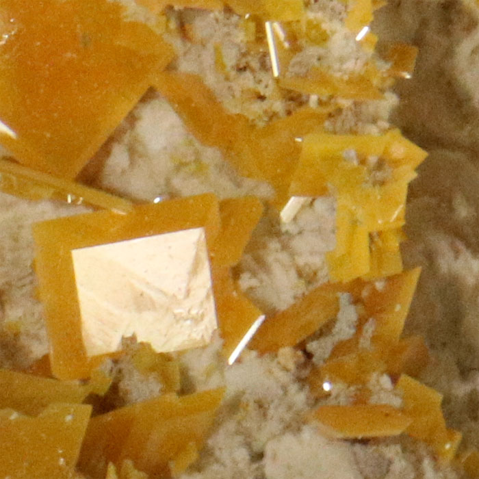 Hübsche Stufe mit vielen, glänzenden Wulfenit-Kristallen von oranger Farbe auf heller Matrix. Die meisten der Kristalle sind wunderbar intakt, einzig einer der grösseren Kristalle ist an einer Stelle angebrochen, was aber nur ganz wenig stört.