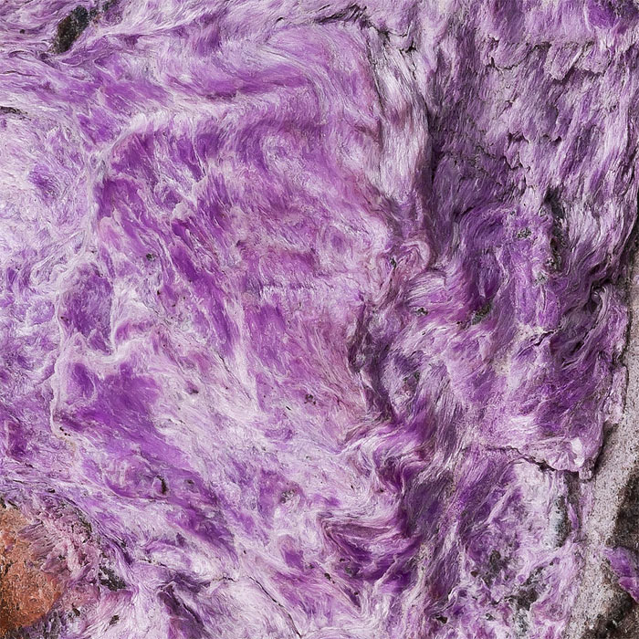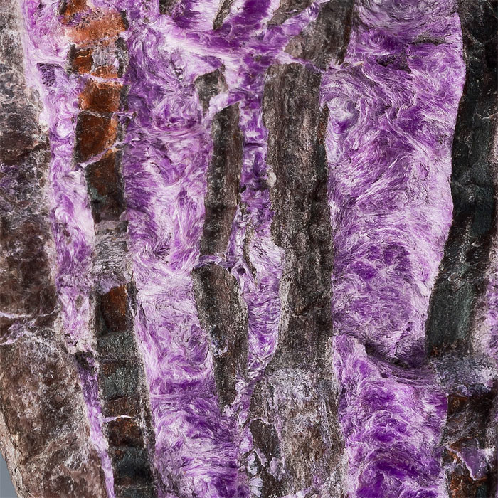 Ein hervorragendes Stück von faserig kristallisiertem Sugilith aus der N'Chwaning III Mine. Dieser Fund wurde um 2014 gemacht, der Sugilith bildet hier eine dicke Zone von seidig glänzenden Kristallnadeln in schwarzem Muttergestein.