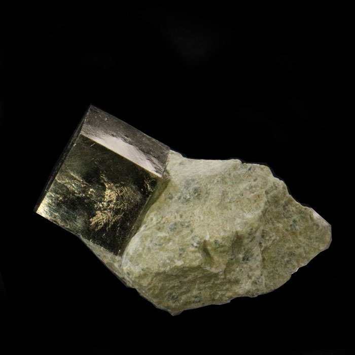 Scharfe, glänzende Kristalle in Würfelform auf beiger Mergel-Matrix.