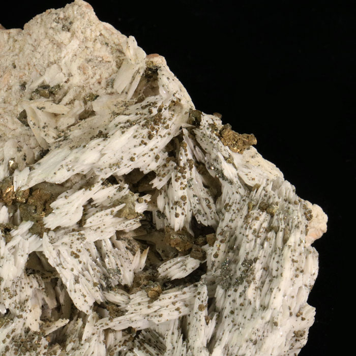 Stufe aus weissen Baryt-Kristallen, übersät mit goldenen, feinen Kupferkies-Kristallen, welche vereinzelt auch etwas grösser sind.