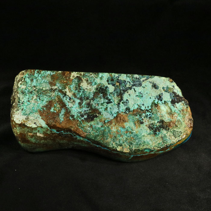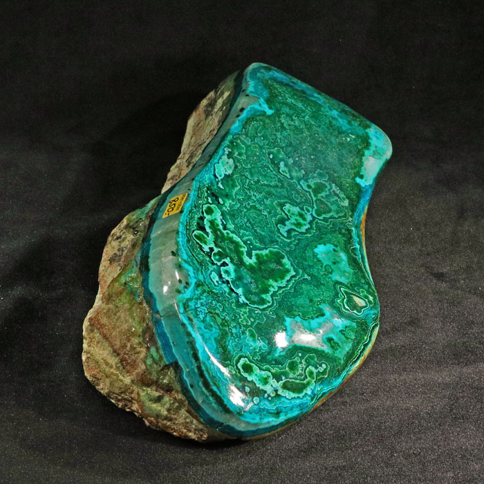 Anschliff mit wunderbarer Zeichnung aus Chrysokoll, Malachit und etwas weissem Quarz. Es ist nur die vordere Seite geschliffen, die hintere Seite ist naturbelassen, doch hat sie ebenfalls ein tolles Muster.