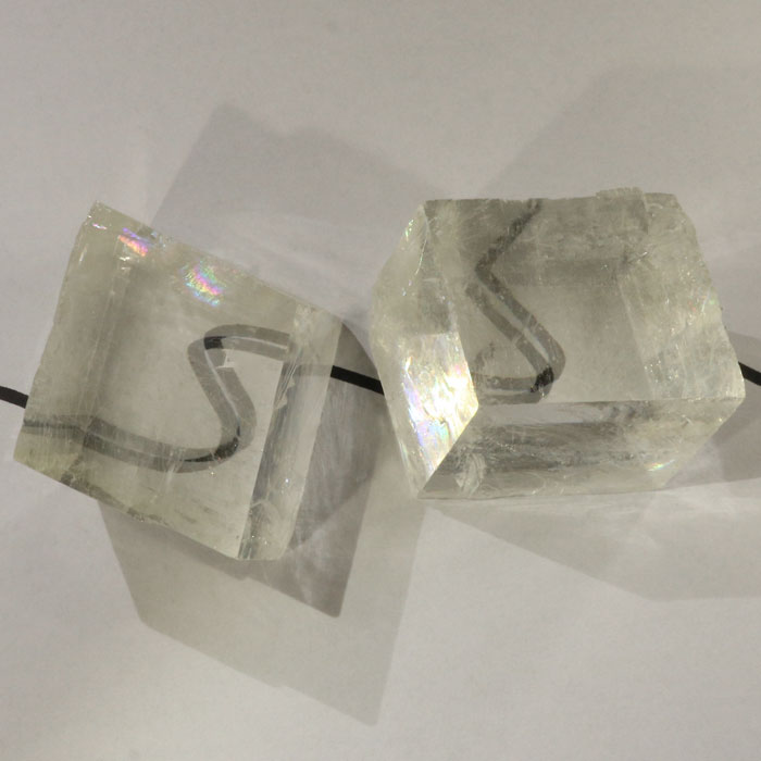 Exemplare von Doppelspat, einem klaren bis weisslichen Calcit, der seine Doppelbrechung sehr schön zeigt.