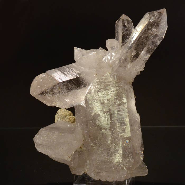 Diese Gruppe mit einem dominanten und weiteren kleineren Spitzen weist keine Druckstellen auf, die Spitzen sind unversehen. Das Stück hat eine flache Basis und steht ganz von alleine. Der grosse Spitz ist im oberen Teil relativ klar.