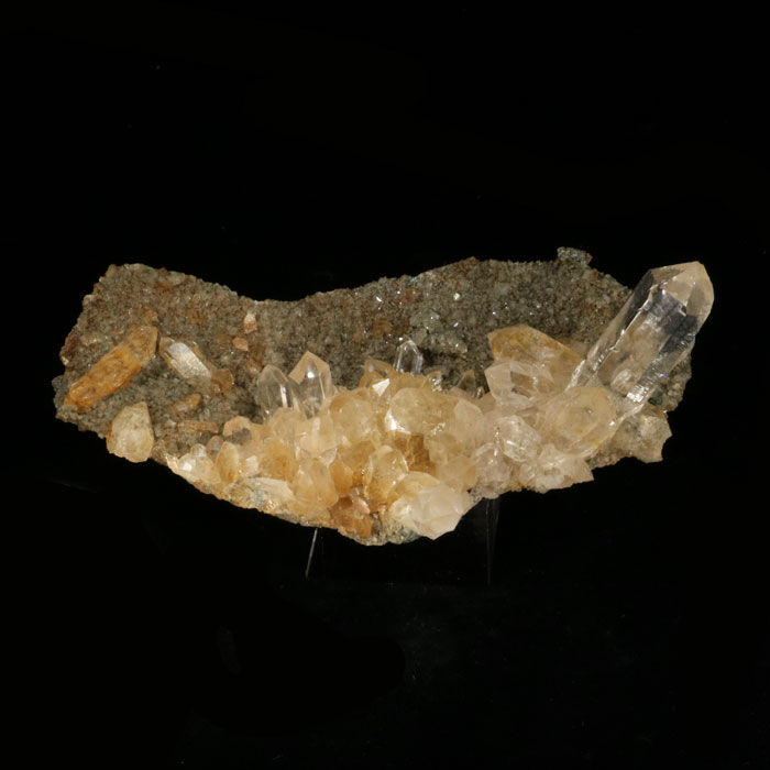 Attraktive Bergkristall-Gruppe mit sowohl etwas milchigeren, als auch extrem klaren Spitzen, auf Muttergestein. Die Spitzen weisen hervorragenden Glanz auf.