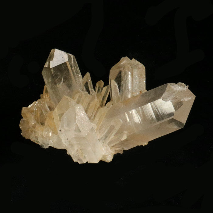 Attraktive Gruppe von Spitzen aus Bergkristall, diese sind sehr klar und weisen schönen Glanz auf. Durch den Limonit-Belag im Basisbereich entsteht ein leichter Gelbstich. Das Stück ist ca. 6 cm lang, 4 cm breit und 5.5 cm hoch.