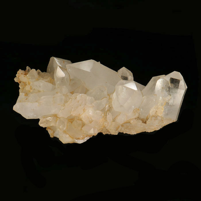 Ausgesprochen feingliedrige, ästhetische Bergkristall-Gruppe, durch einen feinen Belag von Limonit mit attraktivem goldenen Farbton.