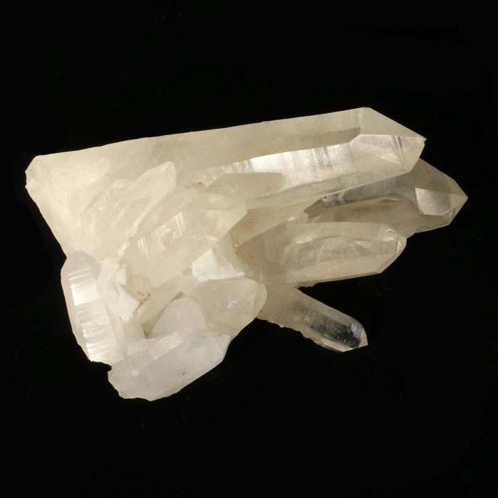 Attraktive Bergkristall-Gruppe mit grösseren Spitzen, die sowohl milchige als auch klarere Zonen und guten Glanz aufweisen. Auf der Gruppe sind einige weisse Dolomit-Kristalle verteilt.