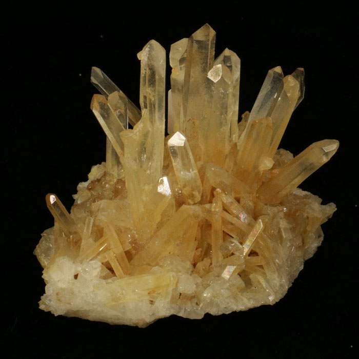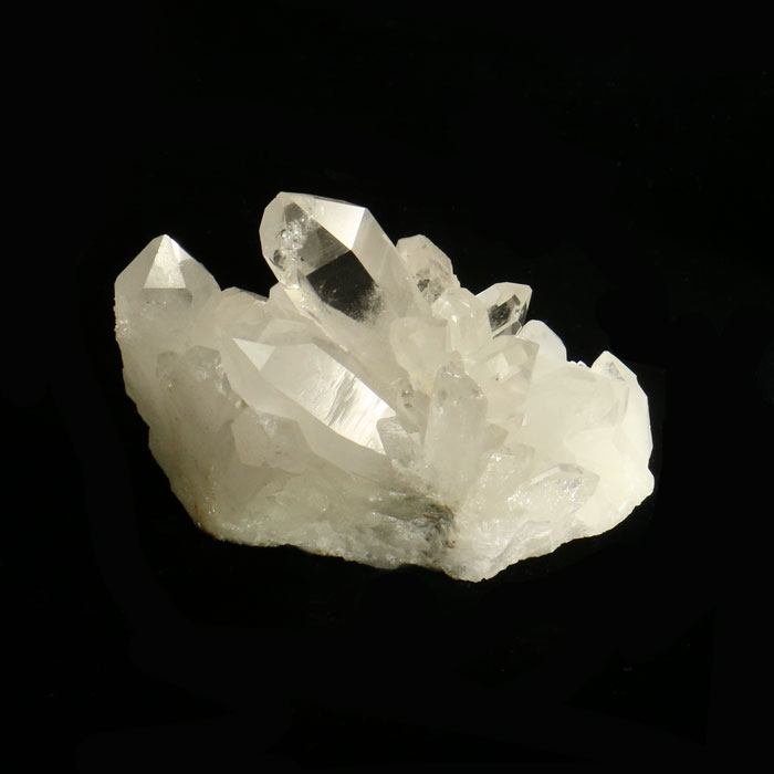 Attraktive Stufe mit sowohl sehr klaren, als auch etwas milchigeren Bergkristall-Spitzen und vielen Albit-Kristallen. Vereinzelt ist auch etwas Chlorit- und Limonit-Belag im Basisbereich zu erkennen.