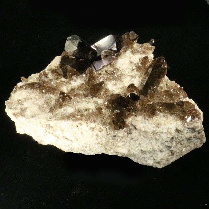 Hochglänzender, sehr dunkler Rauchquarz - die Bezeichnung Morion ist in diesem Fall absolut gerechtfertigt - auf weissem Granit. Ein perfekter Fabrkontrast, wie typisch (und begehrt) für die Alpen ist. Die meisten Kristalle sind eher liegend, eine Spitze ragt etwas empor. Schön intakt, die stehende Spitze zeigt eine kleine Druckstelle.