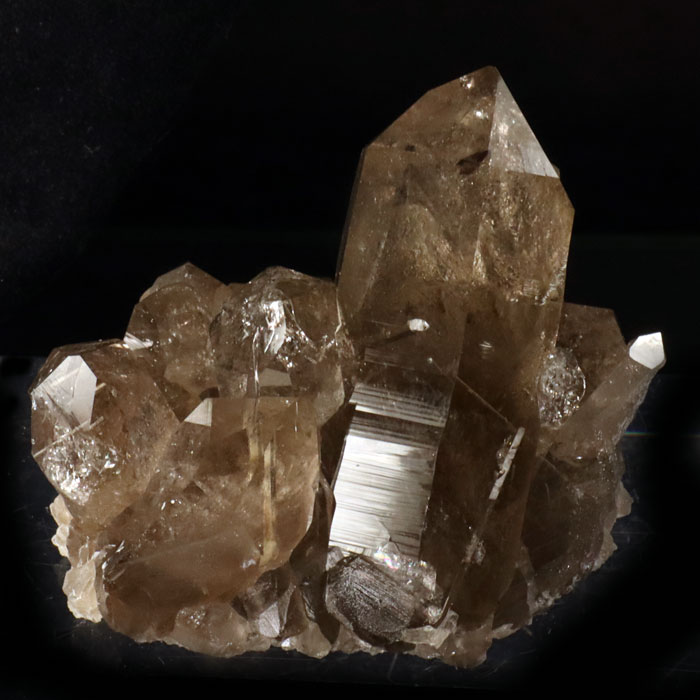 Ein kleiner Glücksfall: attraktive Rauchquarz-Gruppe von 6.5x5 cm Grösse (sämtliche Kristalle sind unbeschädigt), welche mehrere gut sichtbare Anhydrit-Röhren als Einschlüsse zeigen. Auf den Fotos nicht sehr klar zu sehen, sind sie in Natur deutlich erkennbar.