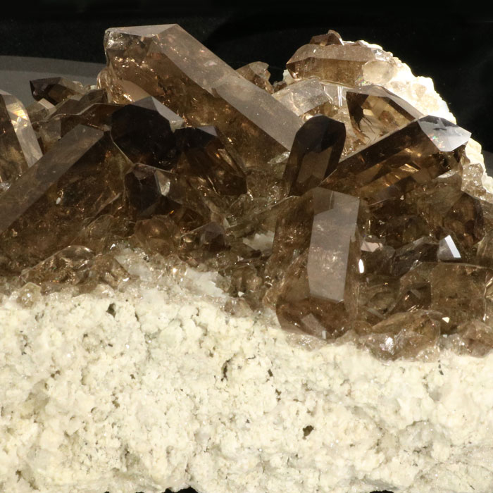 Stattliche Rauchquarz-Gruppe in der Qualität, durch die die Rufibach-Kluft berühmt geworden ist: Hochglänzend, klar, mit kräftiger Farbe und sehr schönem Kontrast zum hellen Granit.