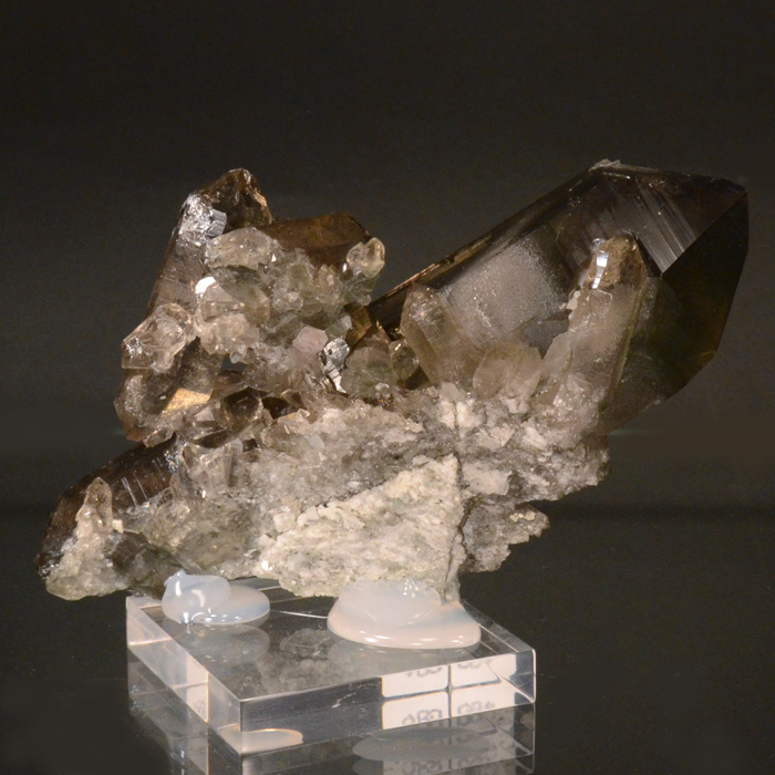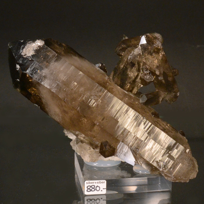 Eine hübsche Rauchquarz-Stufe von der legendären Rufibach-Kluft am Vordre Zinggenstock! Ein Hauptkristall von 13.5 cm Länge, der seitwärts ein interessantes Aggregat trägt, auf welchem ein kleiner 5 mm grosser Rosafluorit aufsitzt.