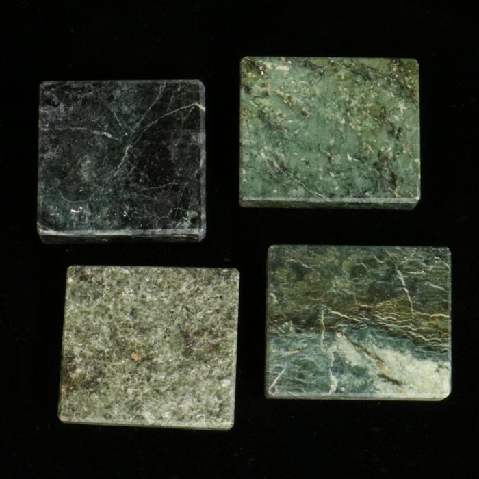 Scheiben von ca. 1 bis 1.5 cm Dicke aus Kalksilikat-Fels, der aus orangem Hessonit-Granat und grünlichem Diopsid besteht.