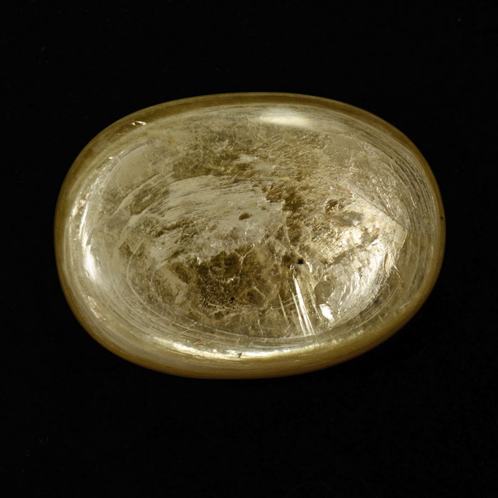 Eine relative Rarität in geschliffener Form: Muskovit, hier zum Massagestein (Hotstone) geschliffen. Hier in hellgelber, fast goldener Farbe mit wunderschönem perlmutt-ähnlichem Schiller.