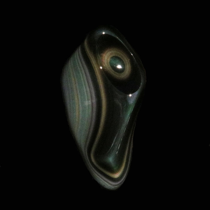 Schleifkunst: Intensiver Farbschiller in den verschiedensten Farben (überwiegend bläulich allerdings) zeichnet dieses rundum polierte Stück aus. Die schwungvolle Schlifform belebt es zusätzlich.