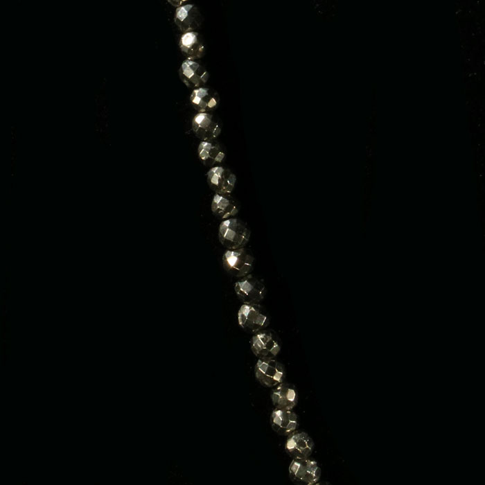 Feine Kette mit facettierten Kugeln (à 2 mm) aus intensiv glänzendem Pyrit. Die Kette lässt sich durch ein Silberkettchen von ca. 44 bis 48 cm verstellen.
