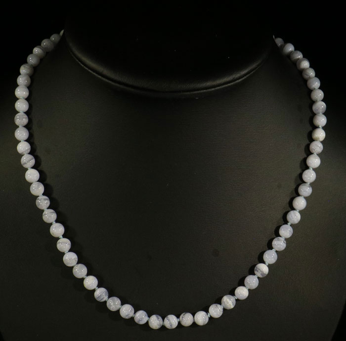 Dezentes Collier aus recht klaren Kugeln von weissem Labradorit. Je nach Lichteinfall zeigen die Steine den begehrten Schiller in verschiedenen Blautönen.