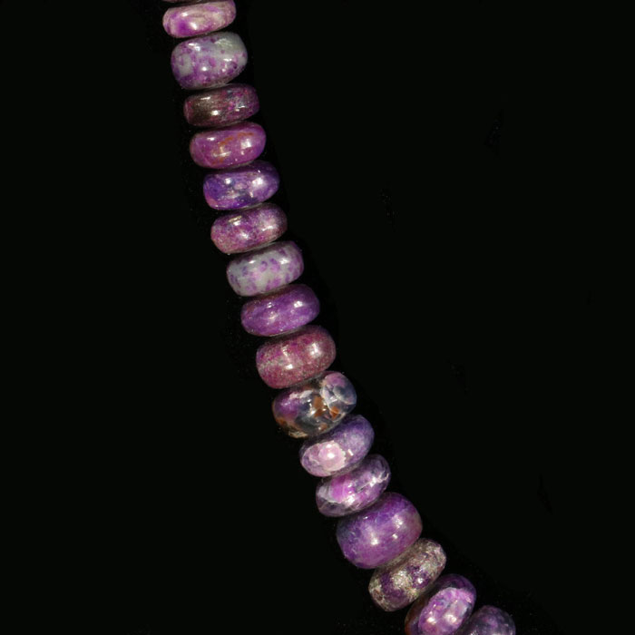 Wunderschöne Kette mit zulaufenden Rondellen (à 4-9 mm) aus Sugilith in kräftiger lila Farbe, mit schöner Musterung. Die Kette ist ca. 44 cm lang und hat ein Verschluss aus Silber.