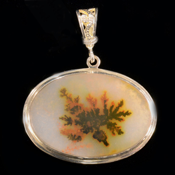 Ovaler Anhänger aus bräunlichem Mikroklin mit leichtem Schiller. Der Stein ist in Silber gefasst und misst inkl. Öse ca. 4.5x2 cm.