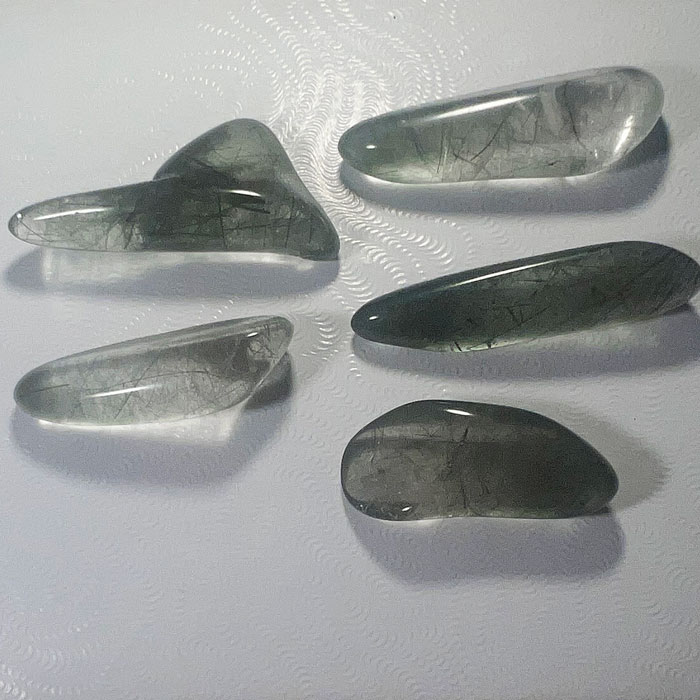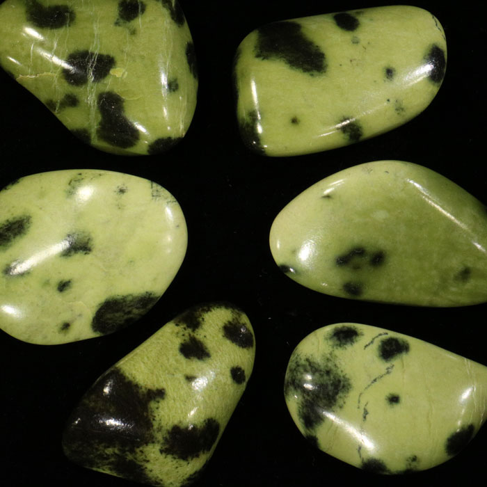 Erlesen schöne, eher flache Trommelsteine aus dem sogenannten "Cheetah"-Serpentin. Rund 4 bis 4.5 cm gross.