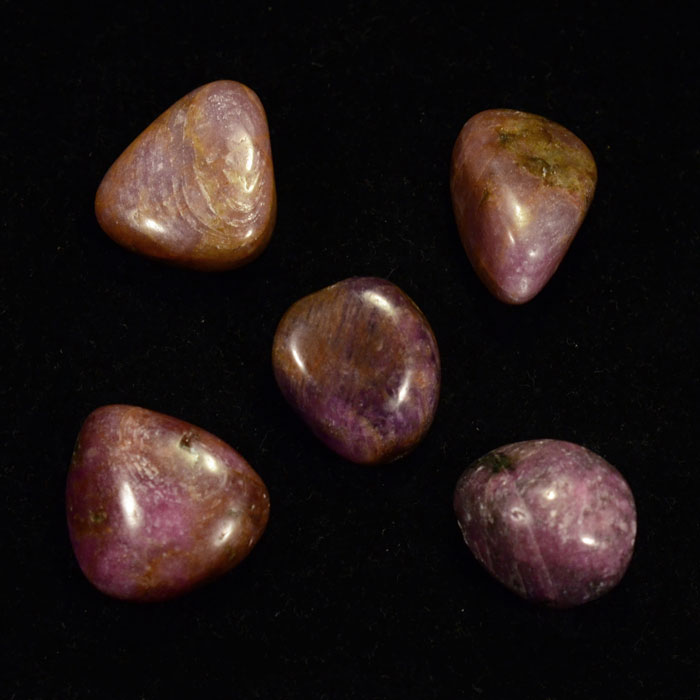 Kleinere Rubin-Trommelsteine von hell-pinker bis dunkel-violetter Farbe, teils auch mit Schiller und teils mit gelben und/oder schwarzen Einschlüssen.
