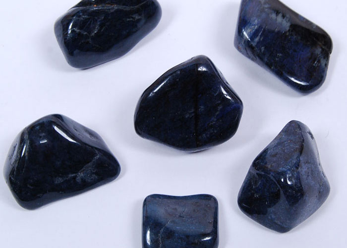 Trommelstein mit schwarzem Muttergestein und Sugilith-Adern in intensivem Lila, mit schöner Musterung. Das Stück misst ca. 3.3x3 cm.